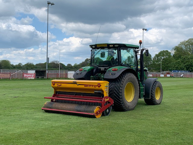 A Vredo overseeder applying a hardwearing grass seed mix to fine turf, ensuring those high-wear areas on sports fields are reseeded in time for the new sporting season.