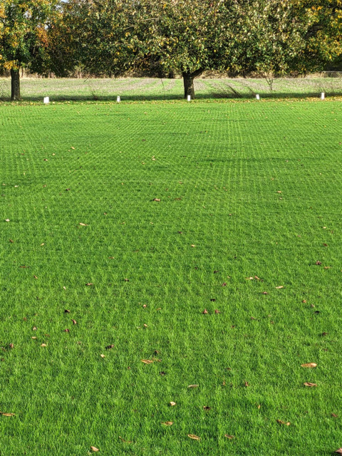 A precision disc coulter overseeder, having completed a double pass on a fine turf sports field. Drilling in alternate directions giving excellent results.